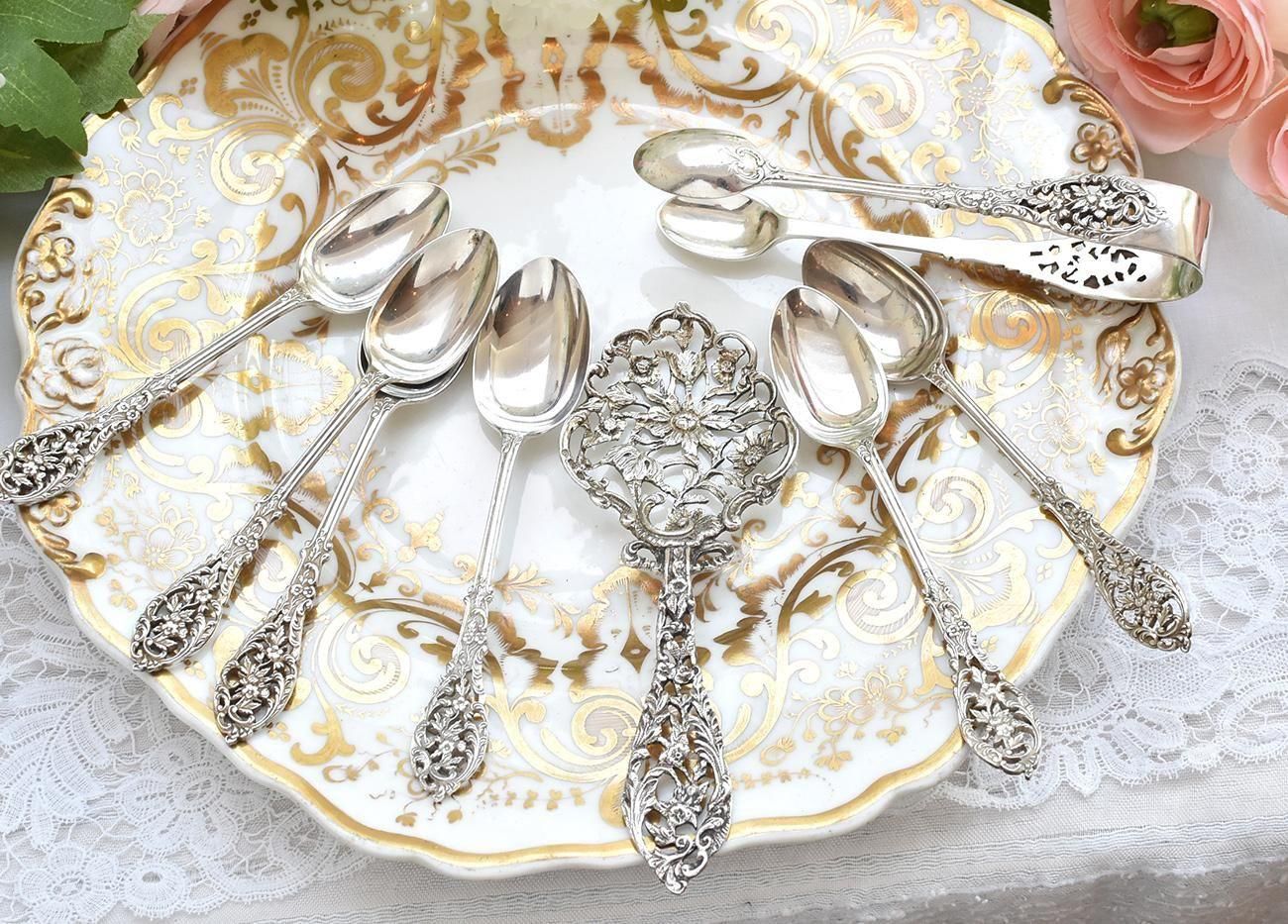 William Comynsのレースの様な美しいティースプーン、シュガートング、ボンボンスプーン、セットでのご紹介です。